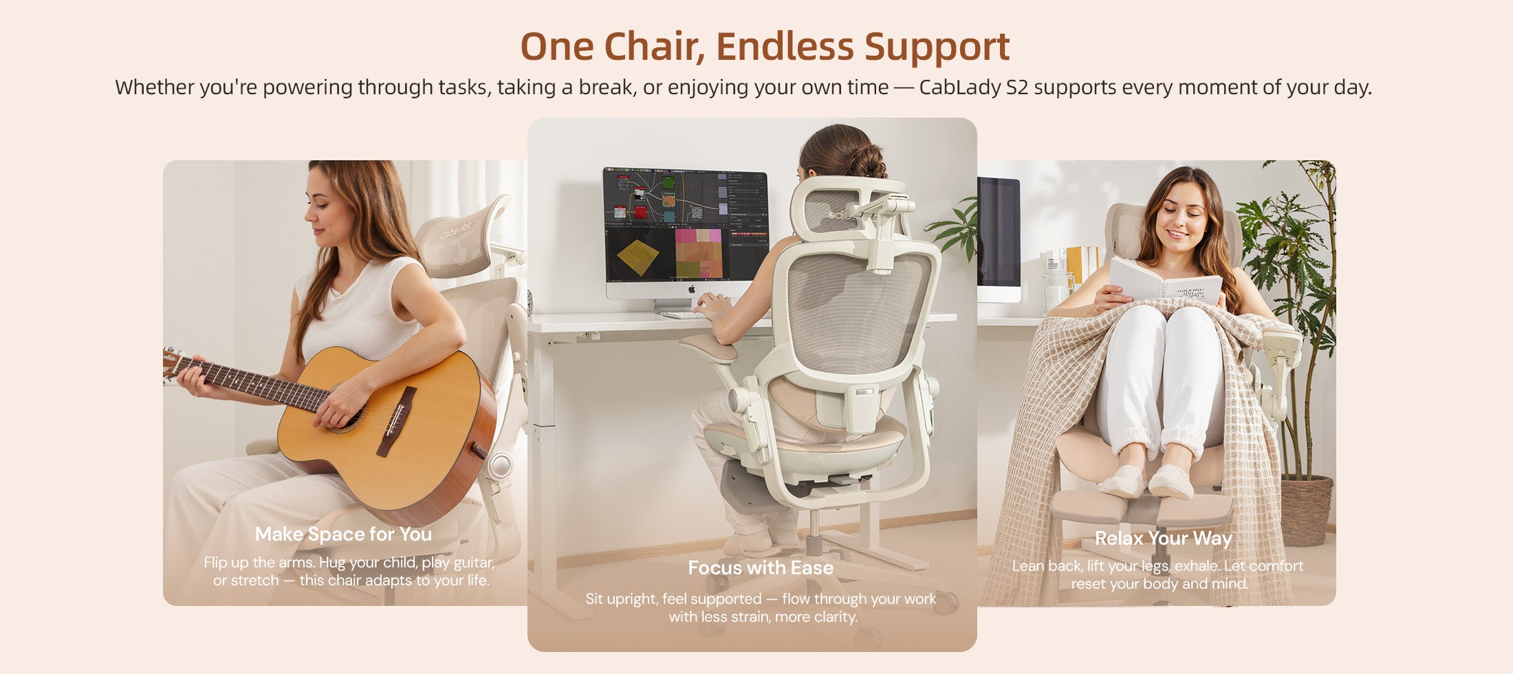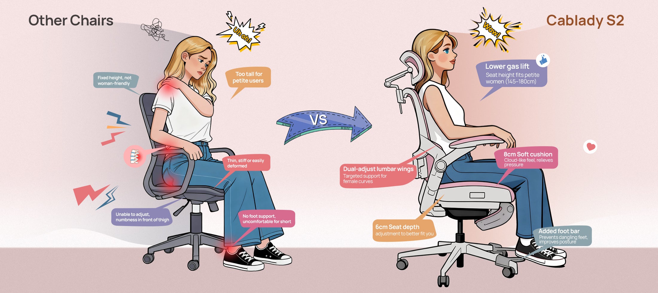 The S2 is designed for women between 145–180cm. For petite users, it offers a lower seat height and an extra foot pedal to prevent dangling legs. The adjustable lumbar support sits closer to the seat for proper waist support, avoiding generic settings. Seat depth, headrest, and armrests are fully adjustable, allowing each user to personalize the chair for maximum comfort and posture support.
