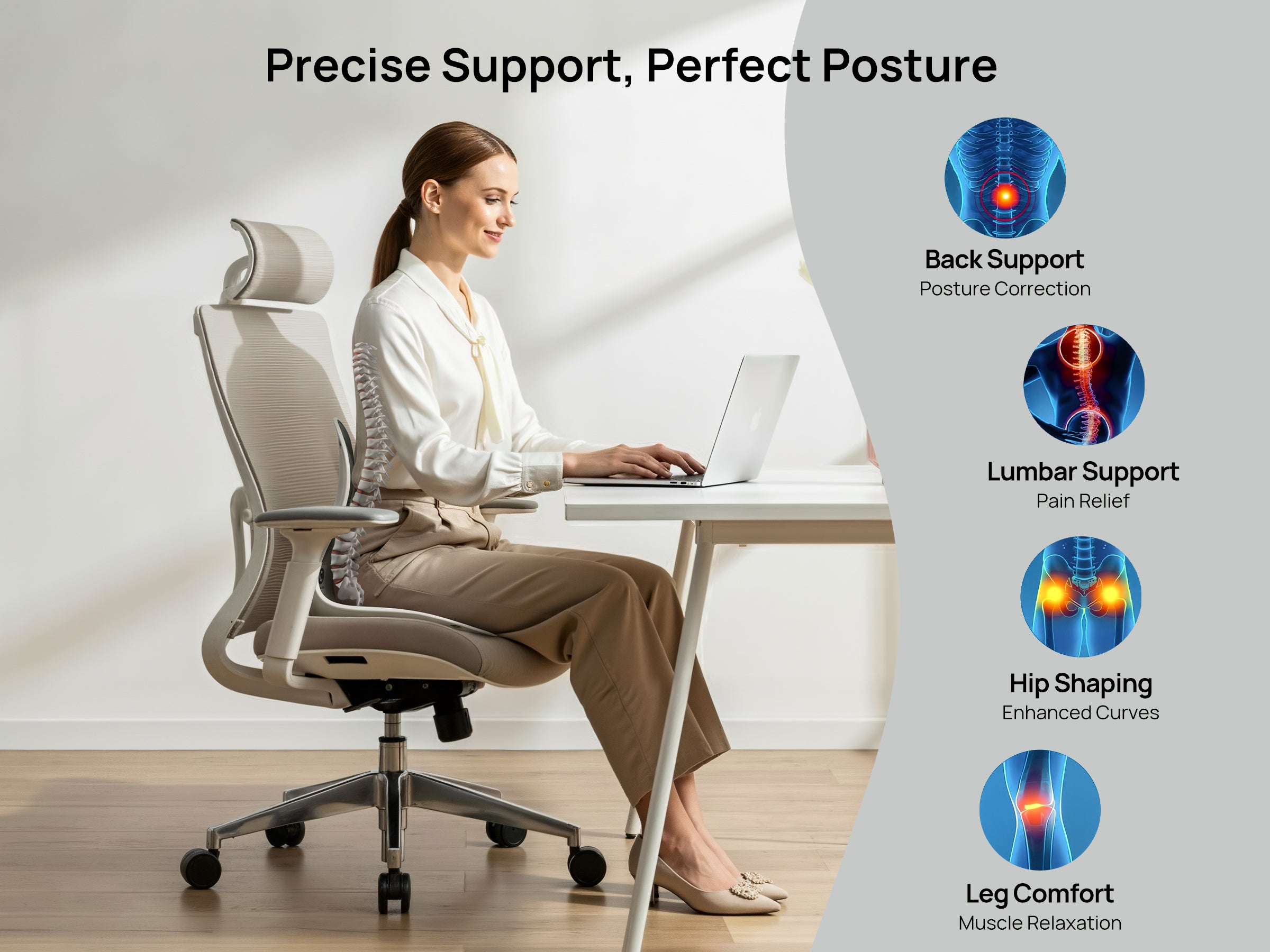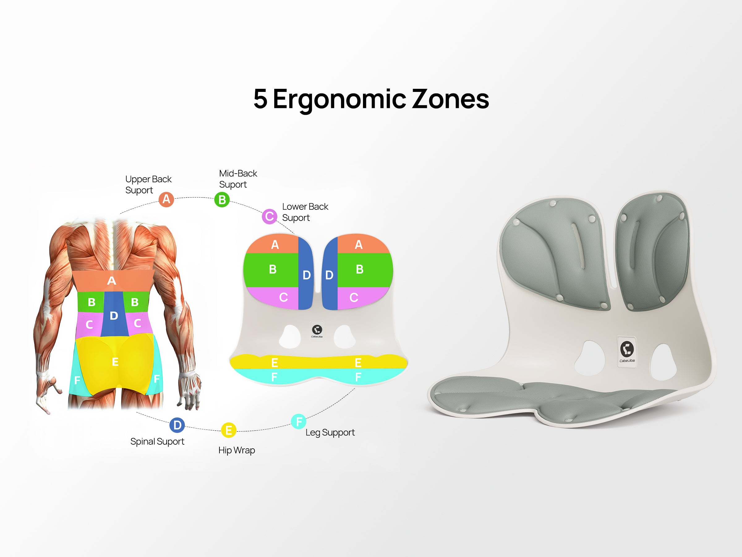 5 ergonomic support zones provide structured alignment for your entire spine and hips. This multi-zone system ensures even weight distribution, reduces pressure buildup, and supports long-term posture improvement.